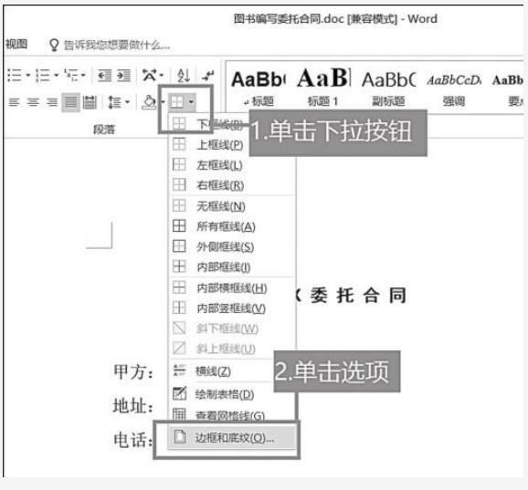 选择所要添加边框的文本,如本例中的双方签字处。单击【开始】选项卡中【段落】组内的边框按钮。