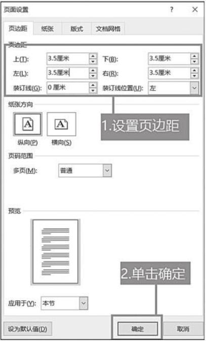 在弹出的【页面设置】对话框中找到【页边距】选项卡中的【页边距】选项组,将上,下,左,右四个选框中数值设置为“3.5厘米”,单击确定。