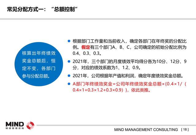 总额控制,就是指核算出年终绩效奖金总额后,恒定不变,各部门参与分配总额。