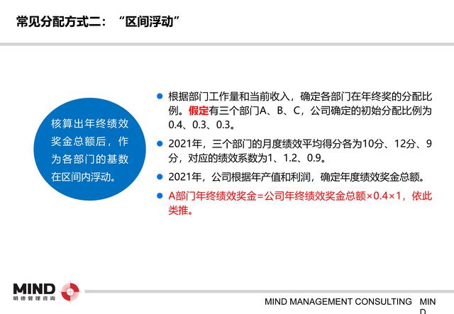 区间浮动,指的是核算出年终绩效奖金总额后,作为各部门的基数在区间内浮动。