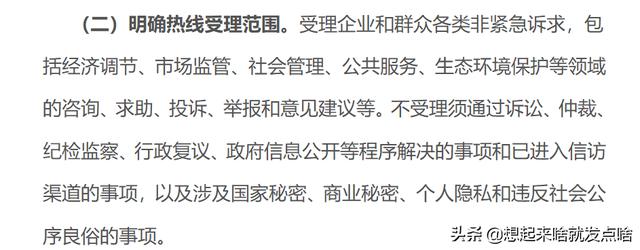 《关于进一步优化地方政务服务便民热线的指导意见》明确规定:不受理须通过诉讼、仲裁、纪检监察、行政复议、政府信息公开等程序解决的事项和已进入信访渠道的事项。