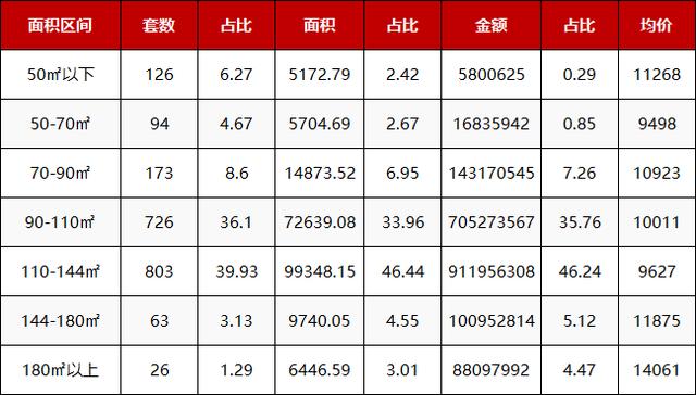 2022年2月,兰州成交的房源中,110-144㎡的套数占比最高,为39.93%,其次为90-110㎡,为36.1%,180㎡以上的占比最低,为1.29%;从面积占比来看,110-144㎡的套数占比最高,为46.44%,其次为90-110㎡,为33.96%,50㎡以下的占比最低,为2.42%;从金额占比来看,110-144㎡的套数占比最高,为46.24%,其次为90-110㎡,为35.76%,50㎡以下的占比最低,为0.29%。