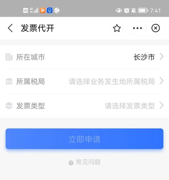 会跳转到这个界面,这时候我们选择我们所在的城市。我们所在城市所属的税务局,以及我们开票的类型。要注意的一点是代开的只能是增值税的普通发票不能是增值税的专用发票。然后我们点击立即申请即可。