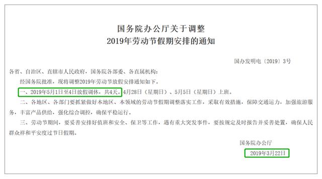 国家临时调整了2019年当年劳动节的放假安排,休息1天改为调休拼假4天。这一天应该是拼假开始的纪念日。