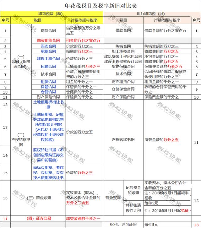 3、营业账簿印花税税率从原先按对“实收资本和资本公积合计”的万分之五降低为万分之二点五,将财税〔2018〕50号规定直接纳入立法。