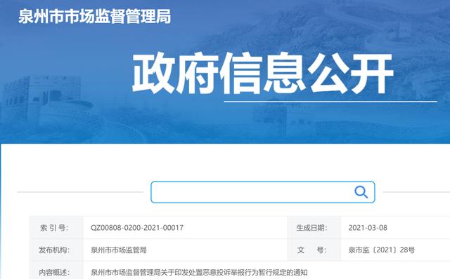 泉州市市场监督管理局关于印发处置恶意投诉举报行为暂行规定的通知
