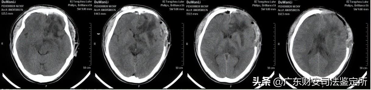 2014-8-5首次术后颅脑CT片示:左侧开颅术后,额颞部分颅骨缺损,双侧额叶、左侧基底节区、侧脑室旁均可见软化灶、形态不规则,左侧侧脑室轻度扩张,中线结构居中。(见附件5-C)