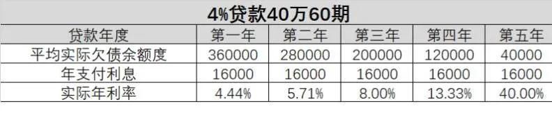 买车的时候,很多车商都联合银行推消费贷款,名义利率都是4%左右,看上去非常优惠,但是每个月的手续费都是固定的,是按照贷款时的总额乘以这个利率算出来的。这样实际利率是远高于这个名义利率的。比如贷款40万,分60期,每个月的手续费是1350远左右,一年的手续费是16000元,但是在最后一年的时候,实际贷款余额年初试试8万,最后一个月是0,所以年平均余额只有4万,但这一年的利息仍然是16000元,所以,这一年的利息实际是40%,是非常高的。