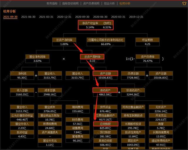 这个应收账款周转率其实是影响在杜邦分析中也是一个非常重要的一个指标,杜邦分析的核心是资产净资产收益率(ROE),ROE则由营业净利润率*总资产周转率*杠杆,其中总资产周转率则等于营业收入除以总资产,而总资产则包含了流动资产里的应收账款,如果应收账款在总体资产中占了很大的比重的话,它也很影响这个总资产的周转率,最后就是影响到这个企业的净资产收益率,而净资产收益率是企业衡量企业盈利能力或者估值的一个最主要的指标。所以如果你看到一家公司的流动资产里就是应收账款占比很高也就是现金回收周期很长的话,就会导致这家公司的净资产收益率很低,也会影响这家公司的估值。
