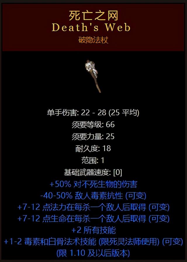 俗称破隐或PY,在“20大”中仅有的几件使用价值极高的武器之一。-50%的毒抗+破隐能力,让死亡之网成为毒NEC的神器之一。唯一的缺点就是可变属性太多,想要刷到一把极品属性的难度很高。