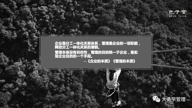 要想搞清楚这些概念,推荐大家去阅读我的老师包政教授的两本著作《企业的本质》和《管理的本质》。企业是分工一体化的关系体系,管理是企业的一项职能,释放分工一体化关系体系的潜能。管理没有目的性,管理的目的统一于企业,是实现企业目的的一个手段。包老师已经把企业和管理给定义清楚了,讲清楚了企业包含了哪些命题,企业和管理之间是什么关系?管理在企业中是以什么方式存在等问题。有着这样一套概念体系,大家就可以在管理的丛林中突围。