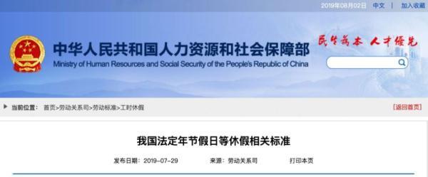 2019年7月29日,人社部官网发布《我国法定年节假日等休假相关标准》,标准提到,法定年节假日是由国家法律、法规统一规定的用以开展纪念、庆祝活动的休息时间,也是劳动者休息时间的一种。