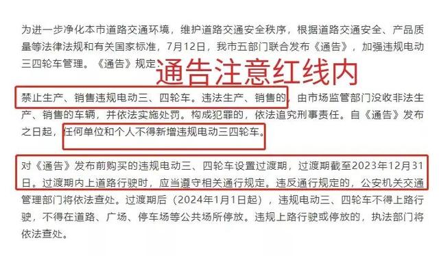 违规电动三四轮车封禁销售;两个硬性条件,未列入《道路机动车辆生产企业及产品公告》,性能不符合机动车安全技术标准,未经工信部许可的车辆,商家不允许以任何方式进行销售,禁止任何单位或个人新增违规电动三、四轮车,如果违规生产销售这类车辆,由市管部门没收车辆,并依法实施处罚,构成犯罪的依法追究刑事责任。这意味着这里车辆全面将退出消费市场,从市场源头杜绝了生存空间。