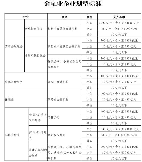 1、按照《中小企业划型标准规定》(工信部联企业〔2011〕300号)和《金融业企业划型标准规定》(银发〔2015〕309号)中的营业收入指标、资产总额指标确定。其中: