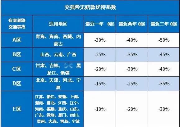 2、2021年交强险无赔款待优系数规定:针对A、B、C、D、E的地区,面相于第一年、第二年、第三年不出交通事故或者理赔的系数,进行了一定的调整,不同的适用地区调整系数不相同,详见: