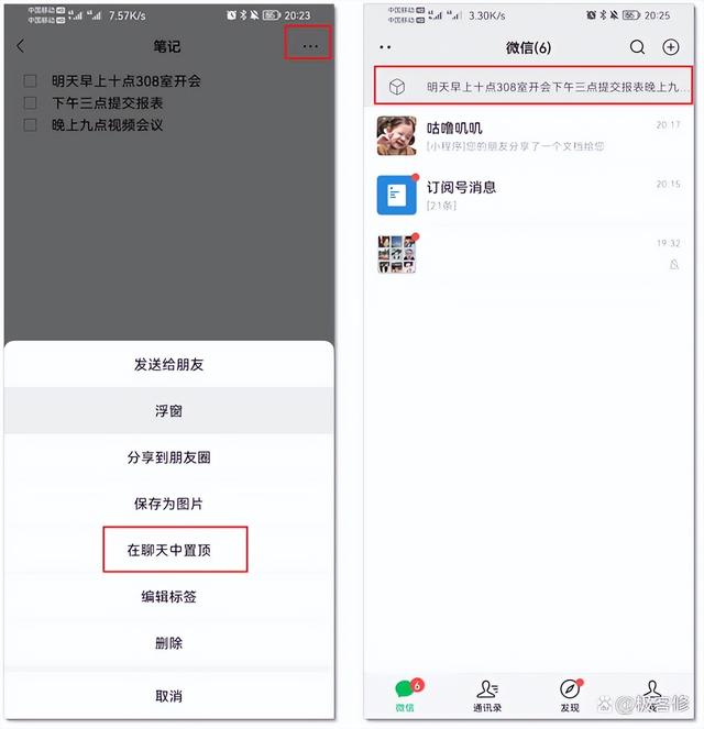 完成后,点击右上角的【···】,选择【在聊天中置顶】,即可在聊天页面一直提醒你!