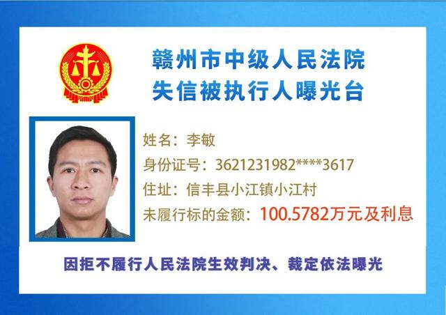 名单信息截止日期为2022年5月24日,根据案件结案情况及时更新,相关信息核实请联系赣州市中级人民法院执行局,欢迎广大人民群众举报失信被执行人行踪及财产线索。更多失信被执行人名单请登录最高人民法院官方网站查询。