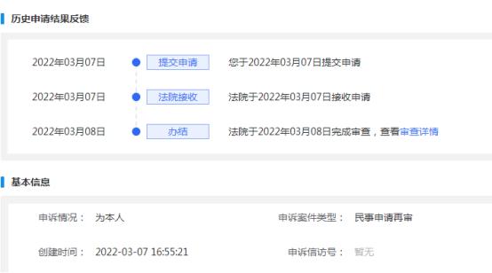3月7日提交申请,3月7日最高人民法院接收,3月8日收到最高人民法院审查结果。回复办理的速度,超过我的预期,为最高人民法院点赞!
