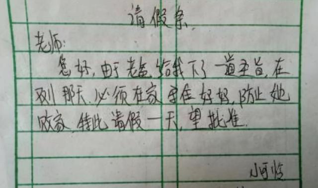 还有一位四年级的学生,因为奶奶摔倒了走路不方便,要请假给奶奶当拐棍儿。虽然写得情真意长,但依旧不是请假的理由。老师也表示,虽然孝心可嘉,但是还是要以学业为重。