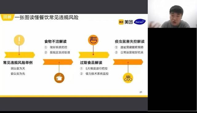 直播课上,老师主要就《食品安全国家标准餐饮服务通用卫生规范》进行讲解,并就《食品安全法》中餐饮服务食品经营者的法定义务、法律责任等知识进行了详细的解读。同时,以餐饮行业案例,详细讲解了学校怎样对食堂食品安全加强监管,管理者和从业人员该如何按规定程序操作,搞好餐饮服务工作。