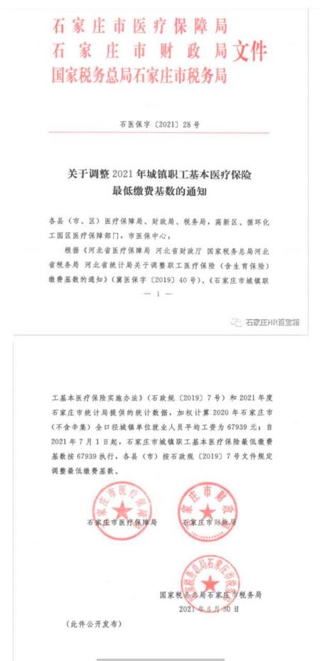 自2021年7月1日起,石家庄市城镇职工基本医疗保险最低缴费基数按67939元执行。