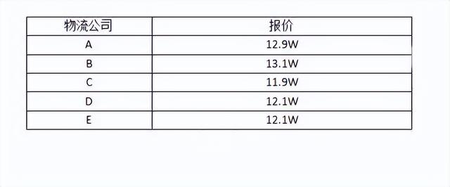A物流公司报价-12.9W,B物流公司报价-13.1W,C物流公司报价-11.9W,D物流公司报价12.1W,E物流公司报价12.1万,AB两家的价报含了税金和保险。