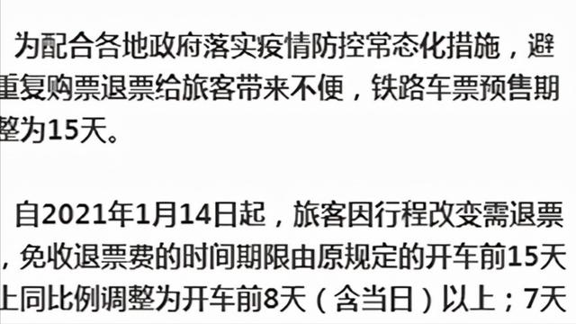 中国铁路车票预售期为15天,如果在此期间发生变动,可以办理退票或改签,政策如下:1、开车前8天(含)退票免收退票费;2、7天至48小时以上是一个退票费档次;3、48-24小时是一个退票费档次;4、24小时以内是一个档次,越靠近发车,退票费比例越高,请游客合理安排自己的行程。