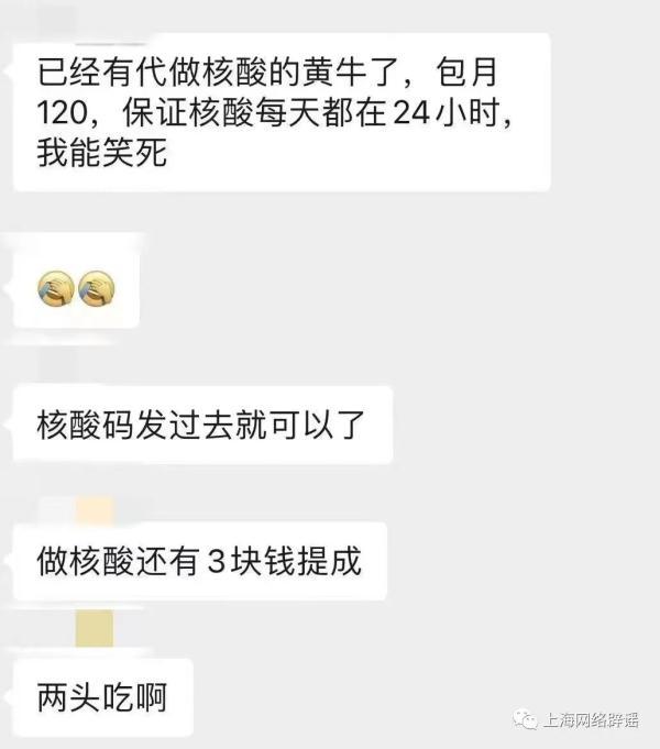 今天,还有一张圈群聊天记录称,上海已经出现了代做核酸的黄牛,“包月120元,保证核酸每天都在24小时”。为此,记者开展了走访调查,暂未找到提供此类服务的黄牛。实际上,本轮疫情期间,不乏有圈群出现“外卖人员代做核酸”等传言,有关部门和平台为此进行过专项行动,通过线上线下等手段严厉监测并打击此类行为。