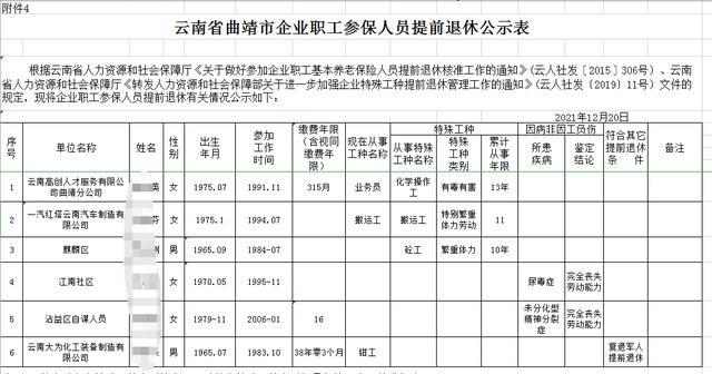 上图是云南省曲靖市最近公示的提前退休人员名单,其中涉及到特殊工种的有三个人,分别符合“有毒有害”、“特别繁重体力劳动”的要求。