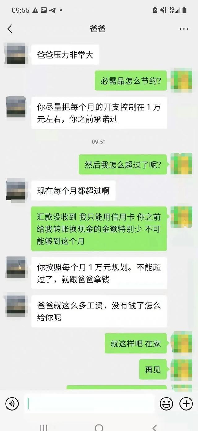 工资到账当天,给了你11000,爸爸的工资已经所剩无几了,你尽量节约啊。