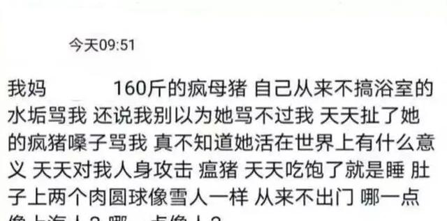她不仅骂自己父亲,还骂自己的母亲,说母亲是160斤的疯母猪。