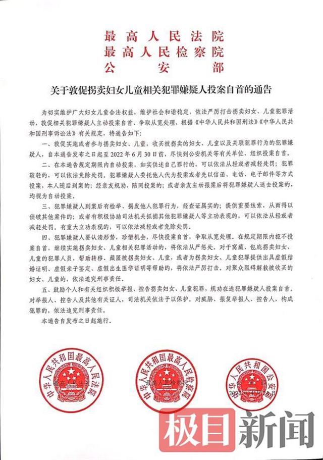 此前,三部门联合发布通告,敦促拐卖妇女儿童相关犯罪嫌疑人投案自首