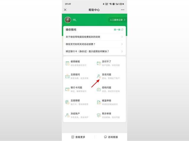 4、在帮助中心页面,点击实名问题。
