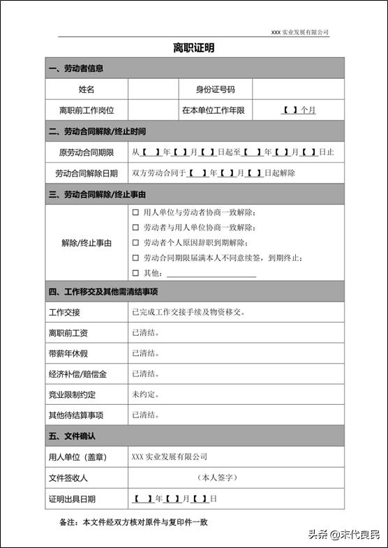 答案是肯定的。所谓无规矩不成方圆,离职证明作为一款标准的文书,并非单凭经手人引以为自豪的文学功底或者驰骋职场多年的工作经验就可以轻松把控的,我们还需要对劳动法规有一个深入的了解。根据《劳动合同法实施条例》第24条规定:“用人单位出具的解除、终止劳动合同的证明,应当写明劳动合同期限、解除或者终止劳动合同的日期、工作岗位、在本单位的工作年限。”由此可见,对于离职证明的撰写国家法律是有明确的规定的,底线就是避雷线,越过了就可能要踩雷。