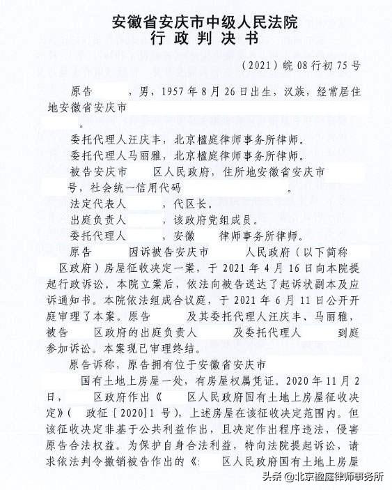 由本所汪庆丰律师、马丽雅律师代理的安徽谭某诉安庆市某区行政主体房屋征收决定一案,经安徽省安庆市中级人民法院审理,于2021年7月30日作出(2021)皖08行初75号《行政判决书》,裁定确认安庆市某区行政主体作出的国有土地上房屋征收决定的行政行为违法,当事人的合法权益得以维护。