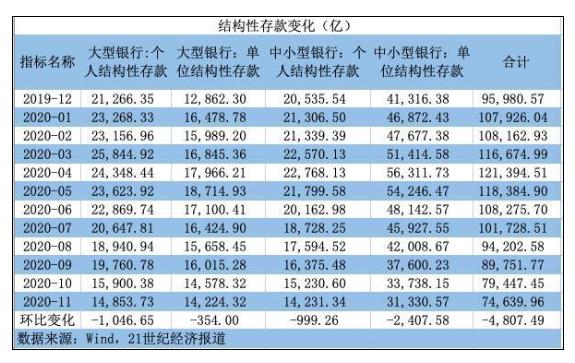 随后各大银行结构性存款规模开始收缩,在2020年4月份的时候,结构性存款规模还达到12万亿左右,但是到了11月底,结构性存款规模已经下降到74,640亿元左右,7个月降幅高达38.5%。
