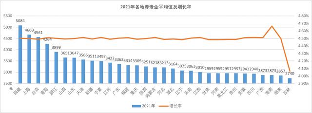 那么各地养老金差异有多大呢?先看一下2021年各地养老金平均值,最高的是西藏,养老金平均值为5084元,而最低的是吉林平均养老金为2740元,差值高达2344元。而印象中最高工资地区的上海和北京分别在第二和第三位,分别为4668元和4561元。