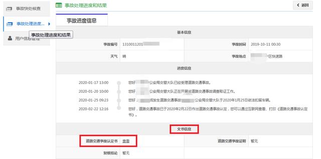 其中,事故处理进度包括案件受理、扣留扣押、调查取证、检验鉴定、损害赔偿调解等内容;事故处理结果包括道路交通事故认定书(证明)、复核结论等内容。
