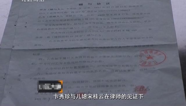 邻居老友劝卞秀珍要多留一个心眼儿,别到时候房子没了,晚年也没有着落。她向宋桂云母子俩表达了自己的担忧,他们理解她的心情,决定通过法律让老人安心。2013年7月3日,老人与宋桂云在律师的帮助下签了一份赠与协议。卞秀珍老人把房子赠给宋桂云,大儿媳要赡养老人、每个月额外给她300元赡养费作为交换。