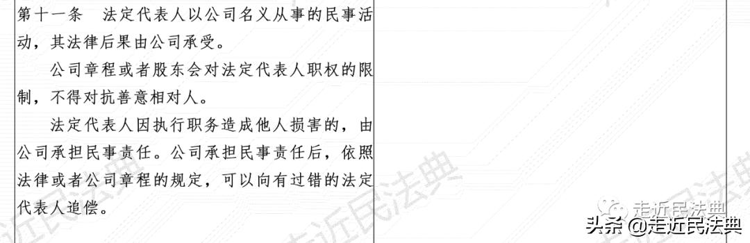 第11条要点:本条虽属公司法修订草案的新增条款,但民法典在第61、62条已有相关规定。公司的法定代表人对外以法人名义进行民事活动时,其与法人之间是代表关系而非代理关系,且其来自法律的明确规定,不需要有法人的授权委托书。其对外的职务行为即为法人行为,后果由法人承担。公司法的本条第1款亦作了类似的规定。需注意,法人对法定代表人所负的责任,也包括越权行为的责任。根据民法典合同编的规定,法人或者其他组织的法定代表人、负责人超越权限订立的合同,除相对人知道或者应当知道其超越权限的以外,该合同对法人发生效力。另需注意,虽然章程对公司来说非常重要,但作为公司内部的行为规范,在通常情况下不易被外部的人员所知道,所以在确定其外部效力方面,要考虑对善意相对人的权益保护。为此,本条第2款对公司章程的对外效力方面作了适当限制,以保护善意相对人的合法权益。关于该款规定的善意相对人的判断,不仅要考量其事实上是否知道法人章程或权力机构对法定代表人代表权的限制,还要考量其是否应当知道这一情况。本条第3款是关于公司法定代表人职务侵权责任的规定。因公司的法定代表人职务侵权产生的法人责任,法人承担责任后可向法定代表人追偿,但追偿的条件有两个:一是法定代表人要存在过错,这里的过错不仅包括故意与重大过失,也包括一般过失(与其他工作人员过错不同的一点);二是要有法律法规或法人章程明确规定。