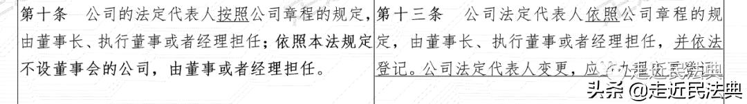 第10条要点:按照民法典的规定,法人的法定代表人是依照法律或者法人章程的规定代表法人从事民事活动的负责人。需注意,法定代表人只能是自然人,且该自然人只有代表法人从事民事活动时才具有这种身份。根据公司法本条的规定,作为营利法人代表的公司,若设置了董事会,法定代表人由董事长、执行董事或者经理担任;若未设董事会,则由董事或者经理担任,该内容属公司法修订草案新增规定。需注意的是,按照公司法修订草案第70条的规定,不设董事会情形下的董事不再明确称为“执行董事”,相关董事会职权由一名董事或经理行使(后有涉及不设董事会情形中执行董事表述删除的,同此处说明,不再重复。但在设置董事会情形下,仍有执行董事这一概念)。民法典第81条第3款关于未设董事会或执行董事的营利法人,规定章程规定的主要负责人为法定代表人。虽然公司法与其表述不尽一致,但由于实践中未设董事会的公司,往往另会通过章程将董事或者经理规定为主要负责人,因而公司法与公司法的规定本质上并不矛盾。