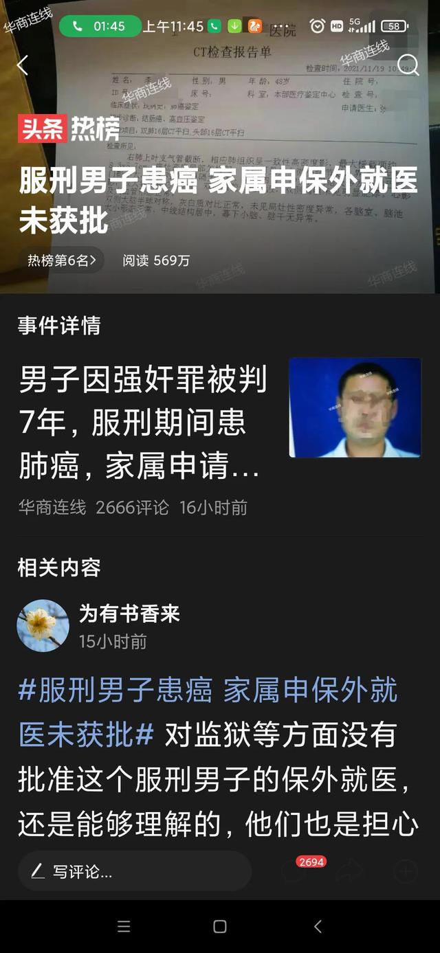 本人在头条热榜上看到这样一条新闻:2022年2月11日,辽宁省葫芦岛市的李女士告诉某报记者,2017年,弟弟因强奸罪被判7年,2019年12月检查出肺癌,2年来保外就医申请一直未获批准,“向相关部门反映了多次,也没有结果。”