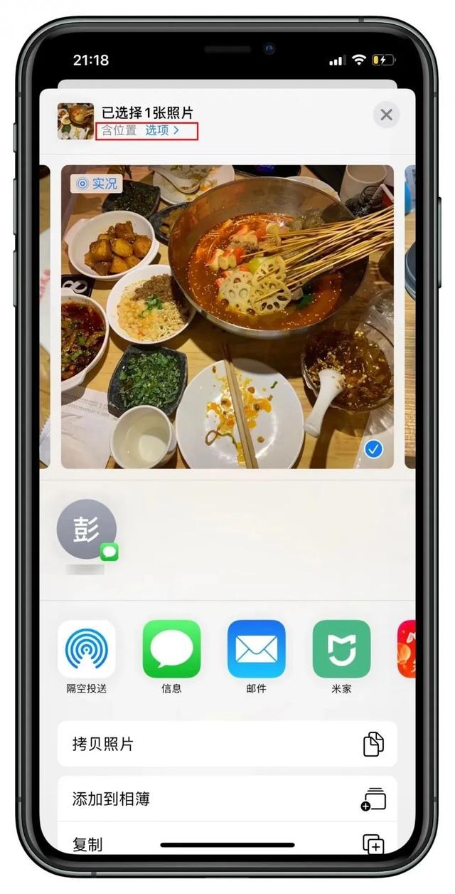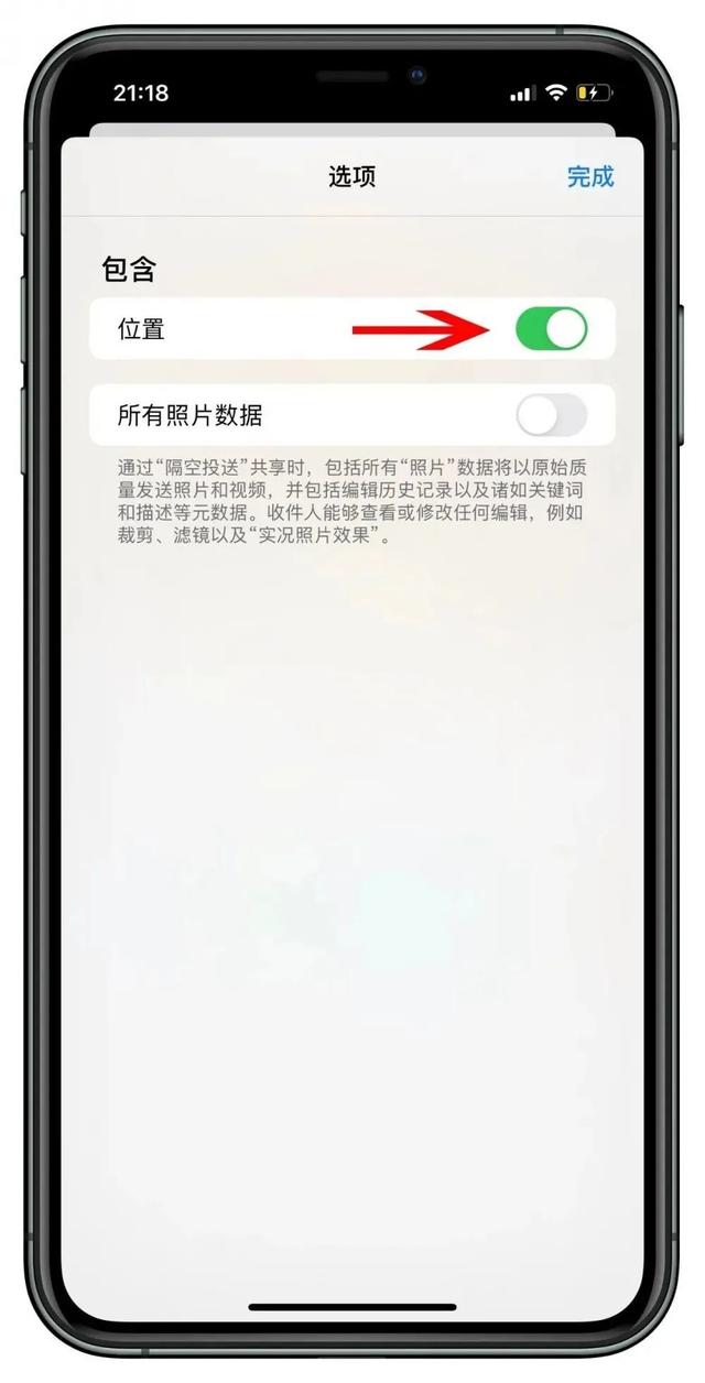 照片分享前打开相册,点击左下角的【分享按钮】弹出分享界面后,点击顶部的【位置】选项,取消默认开启。之后发出的图片将不包含位置信息。