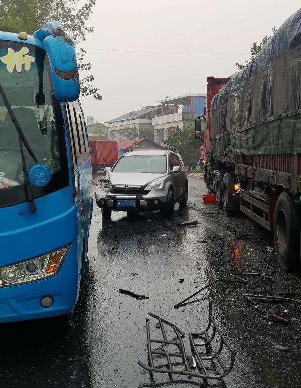 其提供的视频中显示,这起车祸影响到了四台车,分别是小汽车、大货车、小货车和中巴车。小货车已经完全撞进了房屋内,房顶的遮雨板也被撞了一个大缺口。小汽车的右前车灯已经完全凹陷进去,大货车的外边框架散落在公路上。