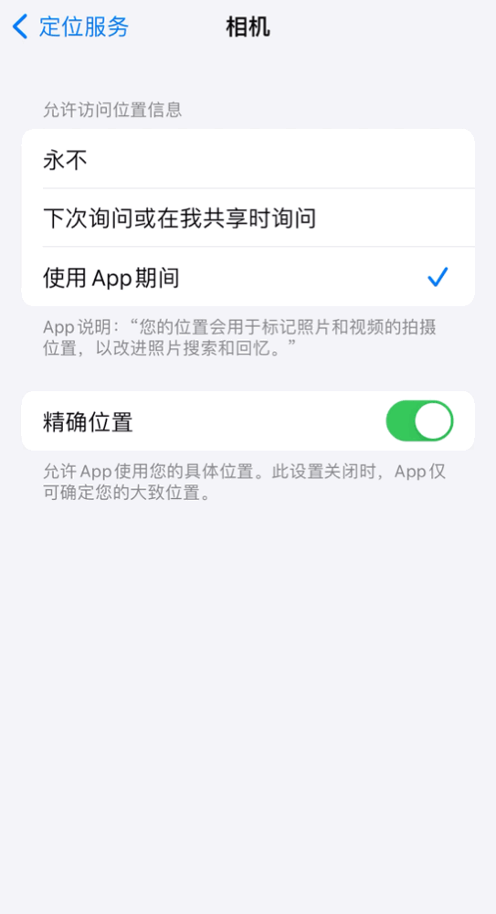 苹果手机用户可在手机设置进行改动:打开“设置”—点开“隐私”—打开“定位服务”—选择“相机”—关闭相关权限↓