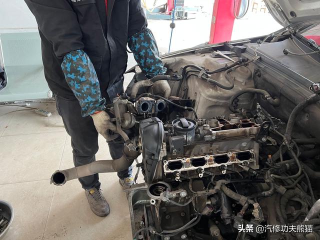 负责拆排气那一边的小哥,手脚也非常麻利,利索的拆掉了涡轮增压器,EA888发动机的精髓有两个,一个是直喷FSI技术,一个就是涡轮增压技术。
