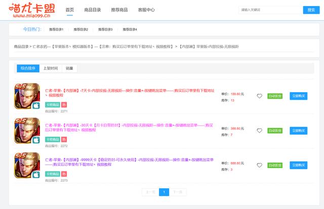 打开竞价出价最高的一家卡盟网站,进去后叫“喵九卡盟”里面大量的违法违规信息黑产销售,其中有游戏解封、快手抖音粉丝点赞,王者荣耀外挂,和平精英外挂,CSGO外挂,使命召唤手游,绝地求生外挂,穿越火线外挂等等。