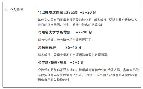 1、通过以上5种情况的自我打分,相信大家有多少分都一清二楚了,分数高低不是绝对,美国签证面试才是最重要的决定因素,当然条件好通过率肯定高。