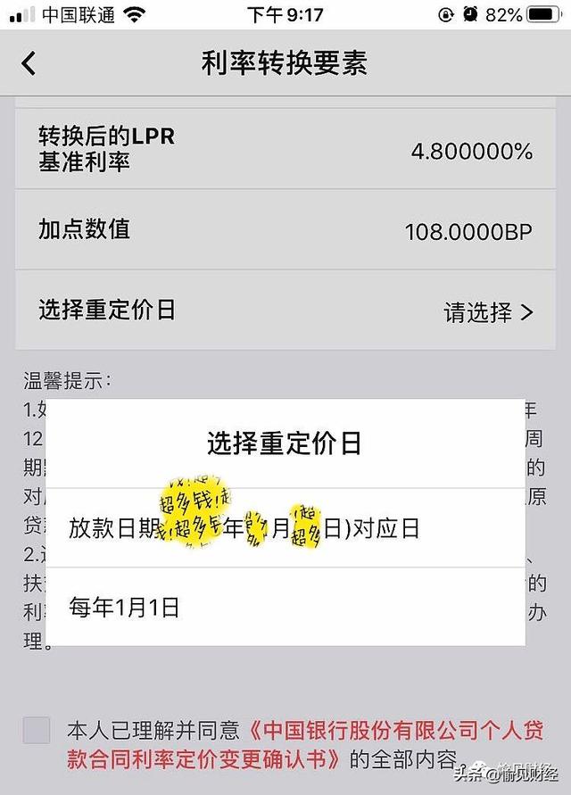 这里的重新定价日,重新定的是上文公式“LPR ± 点差”里头的【LPR】部分。这个LPR可以浮动,央妈说,还可以一年变一变。