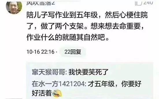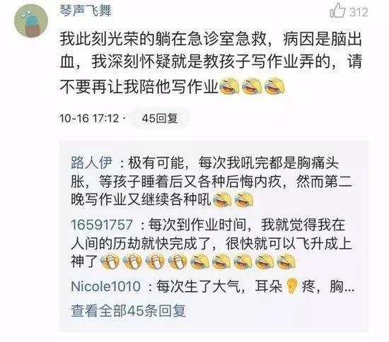 2018年10月29日,南京总医院就接诊了一位33岁的年轻妈妈,在辅导女儿作业时,因为孩子动作磨蹭,晚上十点半还未写完,一动怒,导致头部一根大血管分支血管堵塞,诱发中风。据了解,这是该院接诊的第一例家长辅导作业中风的患者。看来继心梗之后,陪熊孩子写作业的家长队伍又刷出了新高,有家长这样描述自己的心路历程:陪孩子写作业,真有一种亡命天涯的感觉。